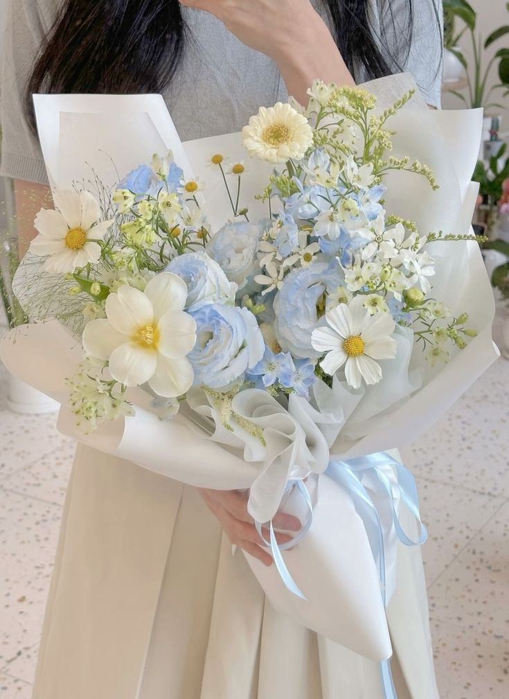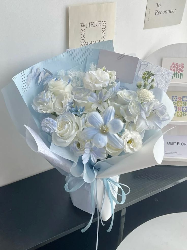 Bouquet ini dibungkus dengan wrapping paper premium bernuansa biru es dan putih salju, dipadukan dengan pita satin lembut untuk memberikan sentuhan akhir yang refined. Estetika keseluruhannya cocok untuk foto konten, hadiah formal, maupun momen personal yang ingin tampil berkesan.