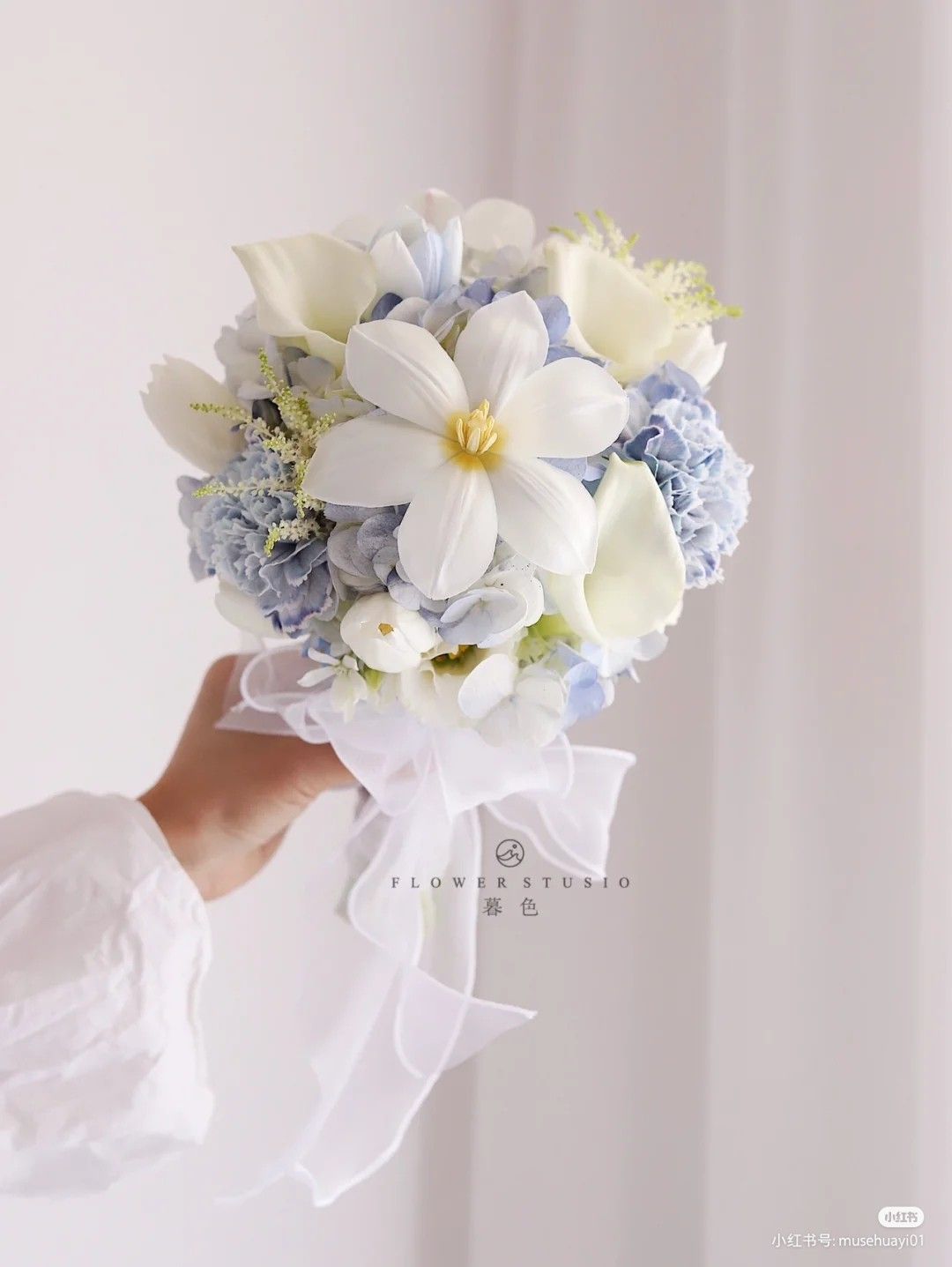 Kombinasi bunga premium biru & putih (hydrangea, lily, rose, carnation, baby breath)