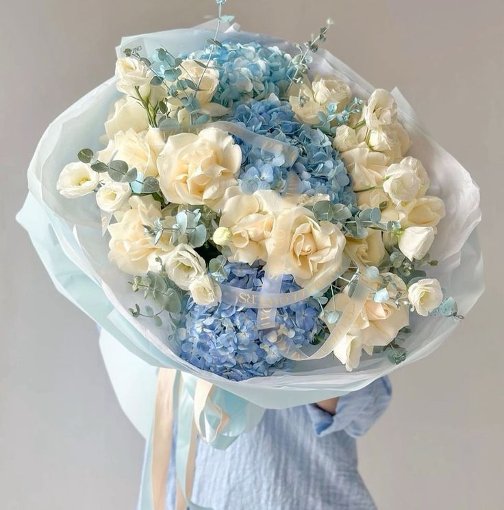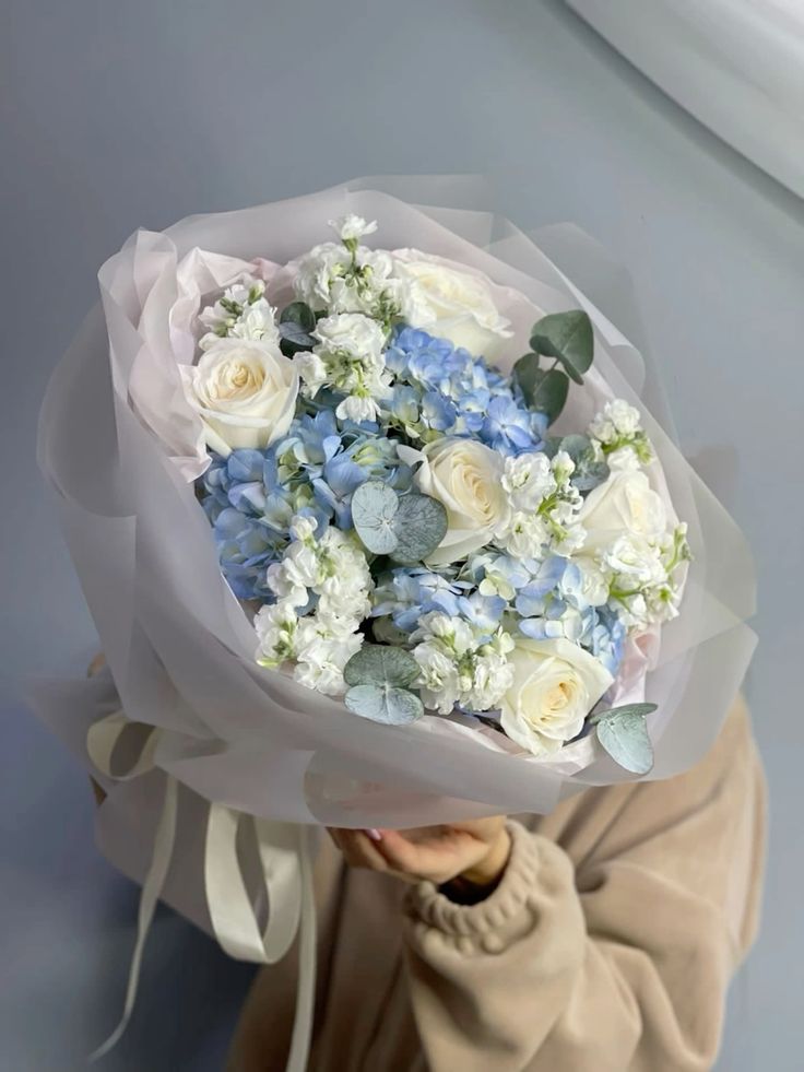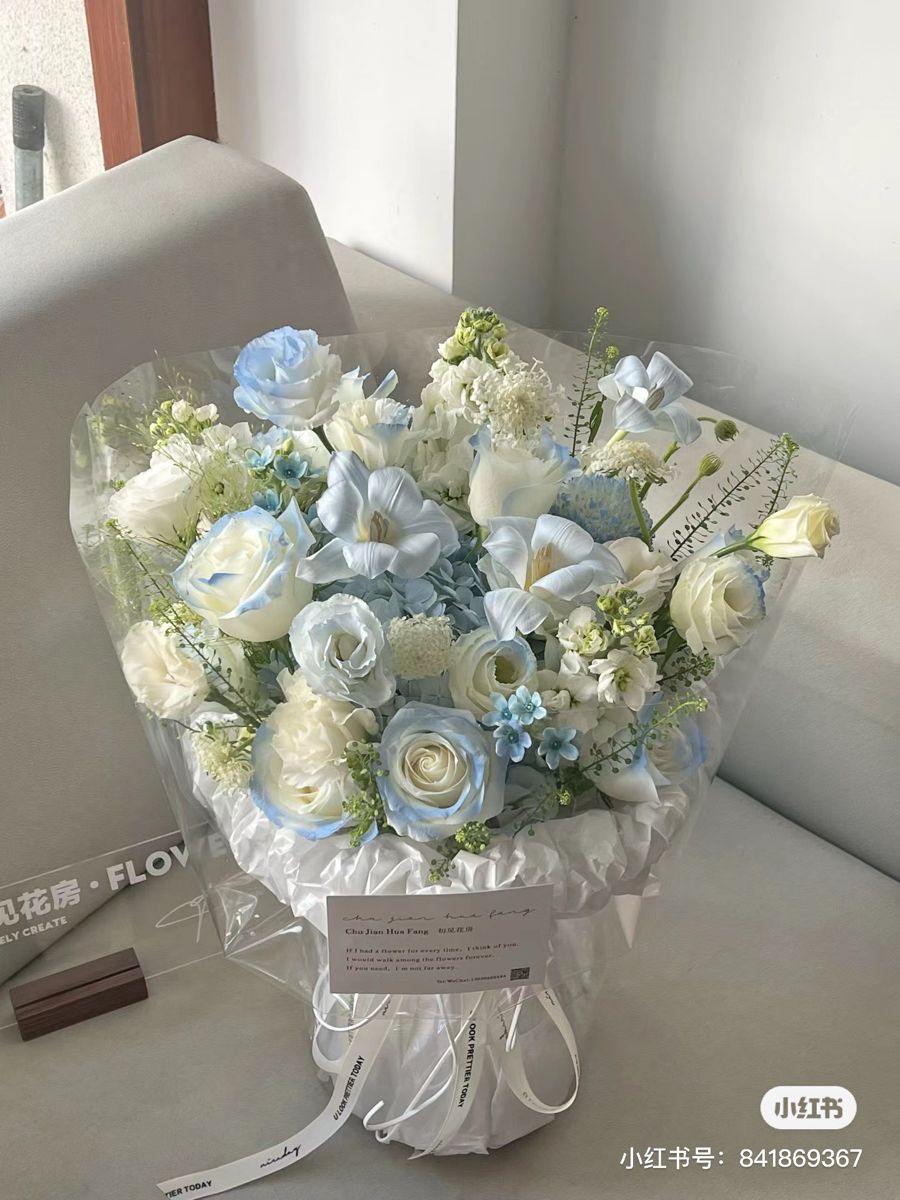 Bouquet dibungkus dengan wrapping paper premium bernuansa midnight blue, icy blue, dan hint lilac–aurora dengan finishing satin ribbon yang mewah. Ensemble ini sangat cocok untuk hadiah eksklusif, dekorasi event, maupun konten foto aesthetic bertema winter & aurora.